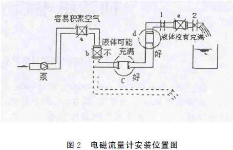 3.2.4對于電極可拆卸的儀表在安裝時方向錯誤。部分污水流量計(jì)的電極并非安裝在表體測量管壁上,而是與表頭一體并可拆卸,在安裝時要注意兩個電極的連線應(yīng)與液體流向保持垂直。3.2.5液體未充滿管道,電極之間含有氣體。管道未充滿液體主要是管網(wǎng)工程設(shè)計(jì)或儀表安裝位置不當(dāng),使傳感器測量管內(nèi)不能充滿液體。應(yīng)避免安裝如圖所示a、e的位置和以虛線管排放時b位置,改裝到c,d位置較好。水平安裝時應(yīng)使電極的連線保持水平,如果電極一上一下,下部電極會由于介質(zhì)內(nèi)雜質(zhì)沉淀覆蓋電極,上部電極會由于氣泡堆積造成電極與介質(zhì)絕緣。垂直安裝時應(yīng)裝在流體自下而上流動的管道上,這樣更容易使液體充滿管道。