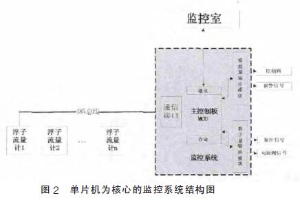 浮子流量計監控系統主要功能是模擬量采集輸出, 數字量采集輸出,由核心模塊進行分析、處理、存儲并和上位機通信。工業上常用的監控系統,從組成結構來看主要分為PLC為核心的監控系統、現場總線為核心的監控系統、單片機為核心的監控系統。本設計主要采用以單片機為核心的監控方法,該系統使用廣泛,體積小、功耗低、操作方便、設計簡便、成本低,是許多小型監控系統的*選。單片機為核心的監控系統結構如圖2所示。本監測系統主要包括現場浮子流量計組、485總線、主控制板MCU 以及模擬數字輸出控制模塊。