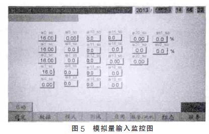 上位機觸控屏軟件是利用觸控屏供應商的組態軟件設計的,作為一個將運用于工業現場的監控設備,其實用性和易用性是使用者比較重視的。當下位機的通訊任務接收到信號量, 主控制模塊就會開始和上位機通信。下位機將采集到處理完整的數據傳輸到上位機內,上位機將其顯示到觸控屏上,使用者可以通過上位機了解空壓機組的實時狀態。圖5 和圖6 就是模擬量和數字量各個通道的實時值顯示畫面。