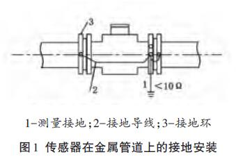 傳感器安裝在塑料管道或內壁有絕緣涂層、襯里的管道上,兩端應安裝接地環(或帶有接地電極的金屬短管),然后用導線連接,使管內流動的介質與大地短路,具有零電位(見圖2)。