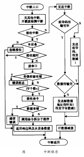 在HART通信中,耐腐蝕污水流量計作為從設備進行通訊,所以這里的軟件設計只是針對于從設備。HART通信采用水平和垂直校驗的方法。當檢測到接收數據有差錯時,則等到主設備命令幀發完后,通知主設備數據接收有誤。主設備則重新發命令幀,從而保證通信的準確可靠。HART中斷子程序流程圖如圖6所示。由于HART通信為主從方式,HART幀中每個字節在物理層傳輸需要9ms左右,為了保證通訊的實時性,通訊程序采用串行口終端接收/發送。該中斷所要完成通信中的主要任務,即接收和發送幀,幀的拆分和打包。