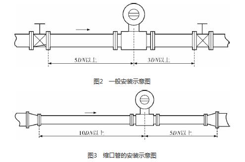 油田污水流量計(jì)廠家的安裝質(zhì)量對(duì)其測(cè)量結(jié)果的影響較大,因此在安裝時(shí)需要注意幾個(gè)問(wèn)題。*先,油田污水流量計(jì)廠家直管段的選擇在配管時(shí)一定要按照要求進(jìn)行選擇,一般選擇流量計(jì)通徑與工藝管道通徑相同,即可滿(mǎn)足工程需要,而且安裝方便、壓力損失小,流量計(jì)直管段上游側(cè)的長(zhǎng)度不少于5倍工藝管道直徑,下游側(cè)的長(zhǎng)度不少于3倍工藝管道直徑(圖2)。但在流速太慢而又要求精度較高或需要變徑的應(yīng)用場(chǎng)合,可選擇通徑小于工藝管道通徑的流量計(jì),以提高測(cè)量精度,此時(shí)流量計(jì)上、下游必須加裝異徑管,且進(jìn)口異徑管上游側(cè)應(yīng)有長(zhǎng)于10倍工藝管道直徑的直管段,下游側(cè)應(yīng)有長(zhǎng)于5倍工藝管道直徑的直管段(圖3)。