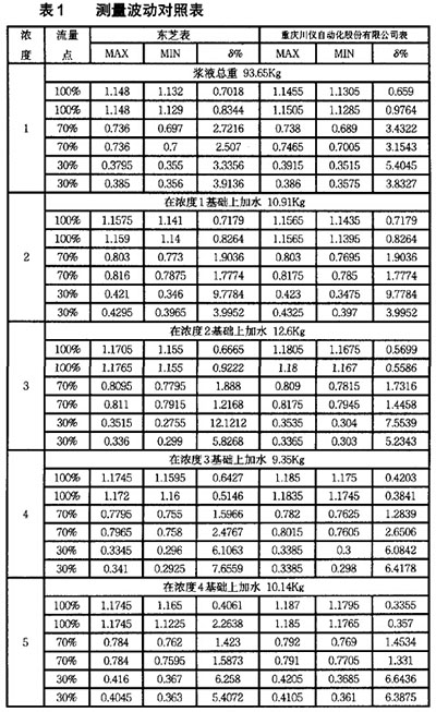 在造紙行業有大量的紙漿液體需要測量,就會用到大量的流量測量儀表,目前在造紙行業中用于測量流量的儀表,主要有防腐濃硫酸電磁流量計等儀表,因為防腐濃硫酸電磁流量計具有非常強的優點,所以非常適合在紙漿的流量測量中使用。在紙漿實驗裝置上,使用串聯在同一管道上該公司生產的漿液型防腐濃硫酸電磁流量計與日本東芝的漿液型防腐濃硫酸電磁流量計測量不同濃度和流量的紙漿漿液,以驗證其可靠性。波動率對比實驗結果表明,該產品用于紙漿漿液測量時能夠很好地克服漿液噪聲。在滿流量測量時,上述實驗中各濃度下漿液測量穩態波動率均在1%以內;其它流量下測量時,由于實驗系統主管道上游分流控制流速不穩,進而導致測量穩態波動率相對較大,甚至達到近7‰ 但由表1可知,在各種漿液濃度及各流量點下,凱銘儀表有限公司生產的漿液型防腐濃硫酸電磁流量計的穩態波動率始終與日本東芝漿液型防腐濃硫酸電磁流量計的測量結果一致,從而表明實驗系統的測量結果能準確反映實際漿液流量大小。 說明:MAX、MIN分別表示該組數據測得流速的的*大值和*小值,單位m/s。
