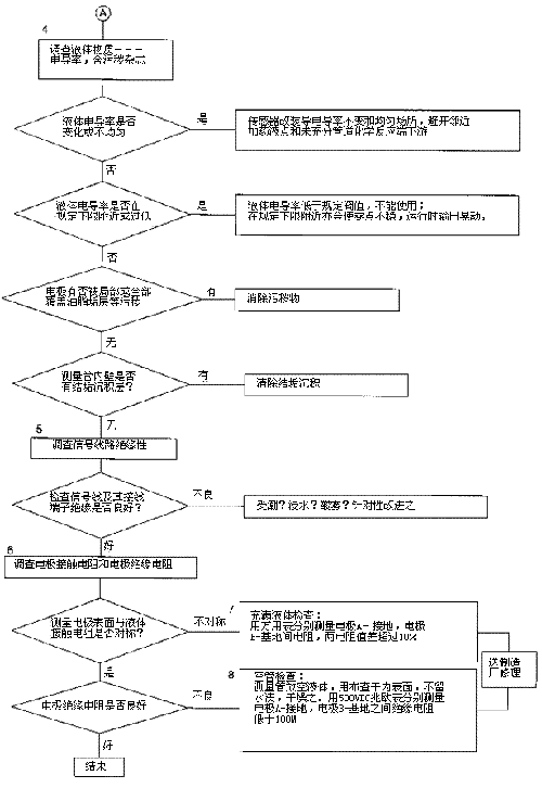 檢查流程圖*5項(xiàng)。信號(hào)回路絕緣下降會(huì)形成零點(diǎn)不穩(wěn)。信號(hào)回路絕緣下降的土要原因足,包極部位絕緣下降所引起的,但也不能排除信號(hào)電纜及其接線端子絕緣下降或破壞。因?yàn)橛袝r(shí)候現(xiàn)場(chǎng)環(huán)境十分嚴(yán)酷,稍一疏忽儀表蓋、導(dǎo)線連接處密封不慎,彌漫著潮氣酸霧或粉粒塵埃侵入儀表接線盒或電纜保護(hù)層,使絕緣卜降。信號(hào)回路絕緣電阻檢查分別按電纜側(cè)和流量傳感器側(cè)兩郵分進(jìn)行,用兆歐表測(cè)試。因信號(hào)電纜容易可先做。流量傳感器再分兩次進(jìn)行:充滿液體測(cè)黽電極表面接觸電阻和個(gè)管后測(cè)量,U極絕緣電阻。