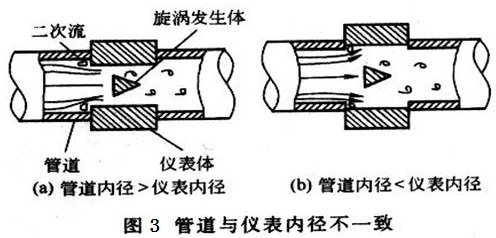 而丙烷流量計與安裝管道內(nèi)徑也會存在誤差,或大或小,如圖3所示,當(dāng)被測介質(zhì)經(jīng)過時,也會發(fā)生二次流動,對測量結(jié)果產(chǎn)生波動影響。