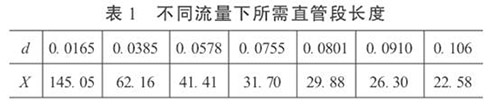 3.直管段長度和硅油流量計精度的初步預測在工程設計中,根據(jù)流體性質(zhì)、流量和雷諾數(shù)確定α和d值。這樣,按照式(5)就可以依不同的流量計精度要求,對直管段長度進行初步預測,或確定直管段長度后,對流量計的精度做初步預測。當δ= 0.2%時,不同流量下所需直管段長度見表1。