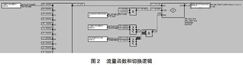 但是由于近期趨勢可能收集不到部分負荷段的相關數(shù)據,在超出現(xiàn)有數(shù)據負荷的部分應采取必要的補救措施,可以參考相同負荷運行的另一臺余熱鍋爐的主蒸汽流量,以此來彌補現(xiàn)有數(shù)據的不足。為了保證數(shù)據切換的可靠性,切換條件要嚴謹,現(xiàn)有函數(shù)的負荷下線上增加25MW與另外一臺的燃機負荷大于100MW。如此設置的好處是當另一臺運行機組突然故障或跳機時保證數(shù)據能及時切換到函數(shù)輸出,保證機組的安全運行。具體操作見圖2。
