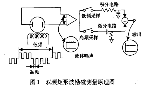 雙頻矩形波勵(lì)磁測量原理如圖l所示,一個(gè)由高低頻分量迭加而成的電磁場通過勵(lì)磁線圈被施加到被測液體中,勵(lì)磁波形是在一個(gè)低頻矩形波上迭加一個(gè)高于市電頻率的矩形波而得到的波形。在產(chǎn)生的電動(dòng)勢中,低頻分量通過一個(gè)大時(shí)間常數(shù)的積分電路獲得一個(gè)零點(diǎn)穩(wěn)定性好的平穩(wěn)流量信號(hào)。而由漿液或低電導(dǎo)率流體產(chǎn)生的低頻噪聲可被不受噪聲影響的高頻采樣電路所抑制,有著同樣時(shí)間常數(shù)的流量信號(hào)經(jīng)過一個(gè)差分電路以確定流速信號(hào)的變化,把這兩種不同頻率采樣所得的信號(hào)結(jié)合起來可獲得一個(gè)穩(wěn)定流速信號(hào),該信號(hào)不受噪聲干擾,且有較高的零點(diǎn)穩(wěn)定性。