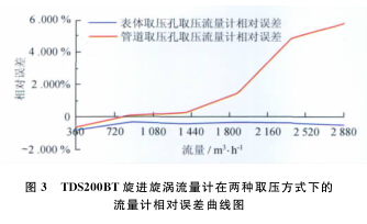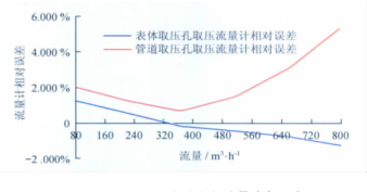 從以上數(shù)據(jù)表和曲線圖中可以看出:天燃?xì)饬髁坑?jì)型號(hào)一定的情況下,用表體取壓孔取壓方式檢定流量計(jì)時(shí)流量計(jì)的線性度較好,用管道取壓孔取壓方式檢定流量計(jì)時(shí)流量計(jì)的線性度較差;流量測(cè)點(diǎn)相同的情況下,表體取壓孔取壓檢定方式的流量計(jì)誤差較小,管道取壓孔取壓檢定方式的流量計(jì)誤差較大;兩種取壓方式引起的誤差隨著流量的增大而逐漸增大,在流量為2 900m3/h時(shí)兩者相差近6.2%,遠(yuǎn)遠(yuǎn)超出了流量計(jì)的準(zhǔn)確度等級(jí)。所以,在天燃?xì)饬髁坑?jì)的檢定過程中,應(yīng)避免在流量計(jì)表體取壓孔以外的地方取壓進(jìn)行檢定。