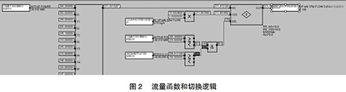 但是由于近期趨勢可能收集不到部分負(fù)荷段的相關(guān)數(shù)據(jù),在超出現(xiàn)有數(shù)據(jù)負(fù)荷的部分應(yīng)采取必要的補(bǔ)救措施,可以參考相同負(fù)荷運(yùn)行的另一臺余熱鍋爐的主蒸汽流量,以此來彌補(bǔ)現(xiàn)有數(shù)據(jù)的不足。為了保證數(shù)據(jù)切換的可靠性,切換條件要嚴(yán)謹(jǐn),現(xiàn)有函數(shù)的負(fù)荷下線上增加25MW與另外一臺的燃機(jī)負(fù)荷大于100MW。如此設(shè)置的好處是當(dāng)另一臺運(yùn)行機(jī)組突然故障或跳機(jī)時保證數(shù)據(jù)能及時切換到函數(shù)輸出,保證機(jī)組的安全運(yùn)行。具體操作見圖2。