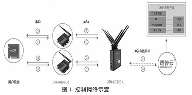 基于 LoRa 技術(shù)的無線流量計由控制,計量,通信,電源,存儲五個模塊組成。以液體流量計為主體的計量模塊將采集到的供暖管道數(shù)據(jù)發(fā)送到通信模塊,基于 LoRa 技術(shù)的通信模塊將流量數(shù)據(jù)存儲并且發(fā)送到由管理人員監(jiān)控的控制模塊,管理人員通過控制模塊和通信模塊向流量計發(fā)送指示。電源模塊是無線流量計的能源中心,可以為流量計的其他模塊提供動力支持。流量計安裝完畢后可在小區(qū)內(nèi)形成控制網(wǎng)絡(luò),網(wǎng)絡(luò)示意圖如圖 1 所示。