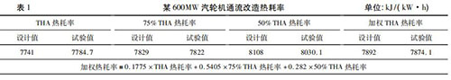 隨著火電機(jī)組利用小時(shí)數(shù)降低,發(fā)電企業(yè)一般都會(huì)根據(jù)不同負(fù)荷工況下的實(shí)際運(yùn)行小時(shí)數(shù),確定機(jī)組熱耗率考核權(quán)重,形成*終的加權(quán)熱耗率考核值。考核加權(quán)熱耗率對(duì)設(shè)備廠家末級(jí)葉片選型、高壓調(diào)門(mén)與高壓缸匹配性提出了更高的要求,在當(dāng)前負(fù)荷率偏低的情況下增強(qiáng)了發(fā)電企業(yè)的競(jìng)爭(zhēng)力。然而,僅僅對(duì)加權(quán)熱耗率進(jìn)行考核是不夠的,設(shè)備廠家為了增強(qiáng)自身的競(jìng)爭(zhēng)力,往往會(huì)把全部重點(diǎn)放在如何降低占比大的低負(fù)荷熱耗率上而犧牲高負(fù)荷的熱耗率,這無(wú)疑削弱了發(fā)電企業(yè)的適應(yīng)性。某廠一臺(tái) 600MW 汽輪機(jī)通流改造時(shí)僅對(duì)加權(quán)熱耗率進(jìn)行考核,THA 熱耗率要高出設(shè)計(jì)值43. 7 kJ/( kW·h) ,詳見(jiàn)表 1。通流改造時(shí)既要對(duì)加權(quán)熱耗率進(jìn)行考核,也要對(duì) THA工況時(shí)熱耗率進(jìn)行考核。