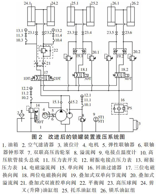 氪氣流量計(jì)原液壓系統(tǒng)圖如圖 1 所示。 通過(guò)分析圖 1 發(fā)現(xiàn),原液壓系統(tǒng)中剪叉油缸組、托爪油缸組及鎖爪油缸組并聯(lián)安裝,并均由齒輪泵供油,該系統(tǒng)設(shè)計(jì)簡(jiǎn)單,液壓元件選擇不夠合理,工作效率低,電機(jī)發(fā)熱大,主要存在的問(wèn)題: