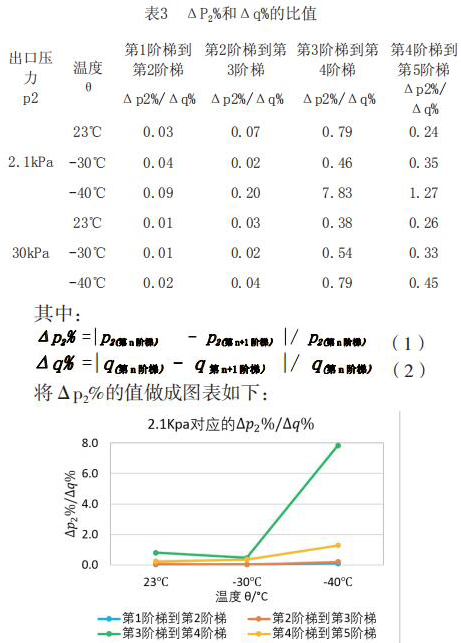 為了更直觀嚴謹的對比每個階段響應速度的不同,對原始數據進行處理,得到如下表格2和表格3。將△p2%/△q%作為響應速度的直觀量化表達,若△p2%/△q%的值大,說明單位流量變化照成的出口壓力變化大,即說明高溫液體流量計響應相對較慢,反之亦然。