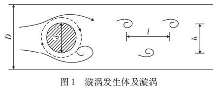 流量計是由漩渦發生體、頻率檢測器和信號轉換器等環節組成,輸出 4 ~ 20 mADC 信號或脈沖電壓信號。其測量原理是在流動的流體中的垂直流動方向安放 1 根或多根非流體型阻流體,在一定的流量范圍內,流體在阻流體兩側交替地分離、釋放出 2 串頻率正比于管道內的平均流速、規則的、不對稱有規律的交替漩渦列,如圖 1 所示,且兩側漩渦旋轉方向相反。采用檢測元件測出漩渦頻率就可以推算出流體的流量。