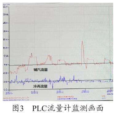 通過圖3 PLC 流量計監測畫面可以看出,PLC 上輔汽測量用的脫硫煙氣流量計的量程設置為30t/h,現場設備量程實際為6t/h,兩者嚴重不符,因此測量值4t/h 為錯誤值(單臺機組運行),需要對程序進行修改。