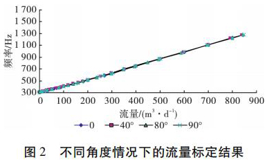 為了考察井眼斜度變化對電磁流量計測量流量的影響,開展了非集流高壓電磁流量計在不同斜度情況下的流量測量模擬實驗。模擬實驗在大慶油田多相流實驗室進(jìn)行,儀器外徑 38 mm,模擬井筒內(nèi)徑為 124 mm,實驗介質(zhì)是水,傾斜角度分別為 0°、40°、80°和 90°( 水平) ,流量范圍為 5 ~ 850 m3 /d。實驗結(jié)果表明,在儀器居中條件下,井眼斜度變化對電磁流量計的儀表常數(shù)沒有影響,滿量程誤差不大于 4% ,因此可以應(yīng)用高壓電磁流量計進(jìn)行水平井注水剖面測量。不同角度情況下的實驗結(jié)果如圖 2 所示。