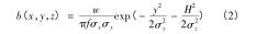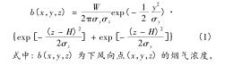 式中: b(x,y,z) = w × e(x,y,z),其中 e(x,y,z) 為二氧化硫濃度與循環(huán)流化床火炬氣流量計(jì)煙氣排放源煙氣強(qiáng)度的比例系數(shù);f 為平均風(fēng)速,m/s; w 為地面空氣內(nèi)煙氣排放強(qiáng)度;σ x 為橫向擴(kuò)散系數(shù)受環(huán)境穩(wěn)定度與下風(fēng)向距離因素的影響程度。式(3)中描述的是基于時間變化的循環(huán)流化床火炬氣流量計(jì)煙氣排放源煙氣排放強(qiáng)度計(jì)算模型。