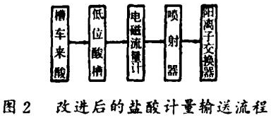 新工藝省去了高位酸槽、酸計量箱和酸霧吸收器,鹽酸計量由電磁流量計控制。該系統是在負壓狀態下運行,消除了溢酸和鹽酸的揮發,解決了對一些設備和設施的腐蝕,以及酸霧對環境的污染問題,使用比較安全可靠。