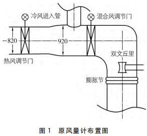 從流量測量角度講,影響流場的主要為熱風(fēng)調(diào)門、擴(kuò)管、彎頭以及一次冷風(fēng)的混入,閘板門和混合風(fēng)調(diào)門由于運(yùn)行時(shí)處于全開狀態(tài),影響可忽略,目前使用了單點(diǎn)雙文丘里管的測量方式,有以下問題: