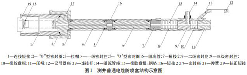 注入剖面測試中,溢流量對測量結(jié)果影響至關(guān)重要。如圖 1 所示,測井普通防噴盒采用 3 級密封: * 1 級密封為阻流管( 6) ,測 20 井次左右阻流管內(nèi)徑變大,溢流量增加; * 2 級為橡膠盤根和鋼墊( 15) ; * 3 級為橡膠盤根( 10) ,調(diào)整壓帽( 11) 松緊程度,橡膠盤根抱緊電纜; * 2 級和* 3 級密封更換一次橡膠盤根測試 3 ~ 5 井次溢流量增加。普通防噴盒無法實(shí)現(xiàn)溢流量,沒有捕捉器、防噴器和放噴組裝件。普通電纜防噴裝置工作壓力20 MPa,耐壓 40 MPa。