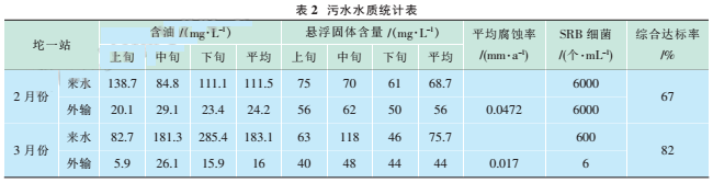 2011年2月坨一站來水含油平均183.1mg/L,外輸含油平均16mg/L,懸浮固體平均8.3mg/L,平均腐蝕率0.017m1m/a,SRB細菌平均6個/mL。只有懸浮固體含址超標。
