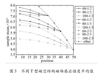 如圖3所示為不同T型磁芯結構下測量區域產生磁場感應強度平均值,圖中橫坐標為T型磁芯b的角度,縱坐標為測量區域的平均磁場強度,圖標表示的是T型磁芯的不同a的角度以及磁芯長端寬度所占的比例。其中以“角度-比例”表示,例如30-1/2表示T型磁芯的較長端角度a為30°,k1/(k1+k2)為1/2時的測量區域中平均磁場強度測量結果。圖標Other為T型磁芯較長端的角度a與較短端的角度b相等(即為23,30,35,40,45,50)時的流量計測量區域中的平均磁場強度。從仿真結果可以看出:T型磁芯的較長端的角度a越小,流量計測量區域中平均磁場強度越大;在T型磁芯的較長端的角度a一定時,T型磁芯的較短端的角度b越小,流量計測量區域中平均磁場強度越大;在T型磁芯的較長端的角度a與較短端的角度b一定時,T型磁芯的k1/(k1 + k2)越小,在流量計測量區域中平均磁場強度越大。