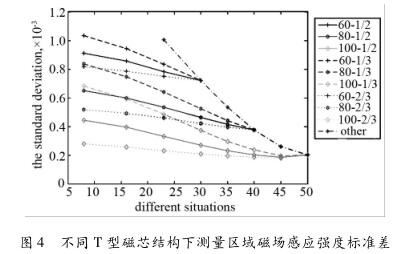 如圖4所示為不同T型磁芯結構下測量區域產生磁場感應強度標準差,圖中橫坐標為T型磁芯b的角度,縱坐標為測量區域磁場強度的標準差,圖標圖例與圖3中一致。從仿真結果可以看出:T型磁芯的較長端的角度a越小,流量計測量區域中磁場強度標準差越大;在T型磁芯的較長端的角度a一定時,T型磁芯的較短端的角度b越小,流量計測量區域中磁場強度標準差越大;在T型磁芯的較長端的角度a與較短端的角度b一定時,T型磁芯的k1/(k1 + k2)越小,在流量計測量區域中磁場強度標準差越大。
