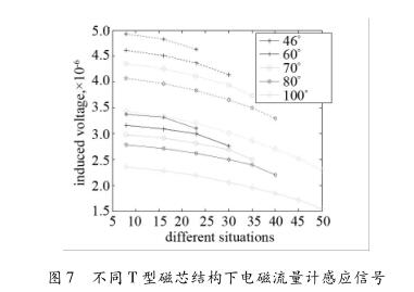 從仿真結果可以看出:T型磁芯的較長端的角度a越小,流量計電極兩端獲得的感應信號越大;在T型磁芯的較長端的角度a一定時,T型磁芯的較短端的角度b越小,流量計電極兩端獲得的感應信號越大。這主要是因為井水流量計勵磁線圈的增加,使得流量計測量區域的磁場強度增加,同樣分布的流速下使得流量計電極兩端的感應信號增加。