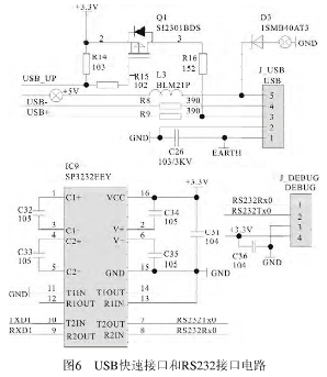 由Q1、R14、R15、R16、L3、D3、R8和R9等元件組成的電路與單片機對應電路,組成等元件組成的電路與單片機對應電路,組成USB快速接口電路。快速接口電路。IC9(SP3232EEY)芯片與周圍元)芯片與周圍元件組成RS232接口電路。電路如圖6所示。