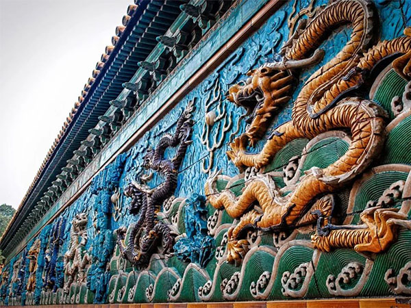 在紫禁城內(nèi)九條龍采用藍(lán)、紫、黃、白、黑等色,重色深沉敦厚,淺色明媚婉麗。琉璃壁的下層,以綠色表達(dá)海浪的深邃,以白色點(diǎn)明凌空盡濺的浪花,形成了瞬息萬變的激浪,又以近水襯托遠(yuǎn)水,以遠(yuǎn)水近浪共同襯托九龍,使整個(gè)畫面看上去雄偉壯闊,仿佛能聽到巨龍的長嘶和海水的咆哮。